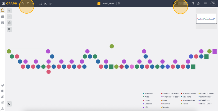 The left side of the top bar includes tools like Quick Find, Filters, and more. These tools enhance graph interaction and allow bulk selection of Entities. On the right side, a toggle lets you switch between the graph view, a map view, and a table view.