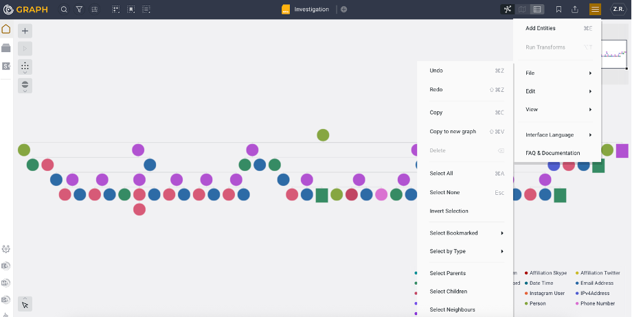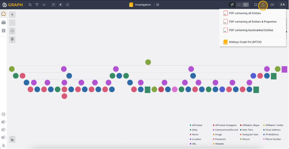 To export the entire graph, use the Export option. You can export all Entities, Entities with properties, or bookmarked Entities as a PDF. Additionally, you can export your graph as a Maltego Graph file (.mtgx) and continue your investigation in Maltego Graph (Desktop).