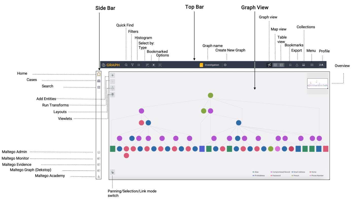 The Maltego Graph (Browser) interface is divided into three main sections: the top bar, side bar, and the graph area. Each section is designed to provide specific tools and options for seamless interaction.