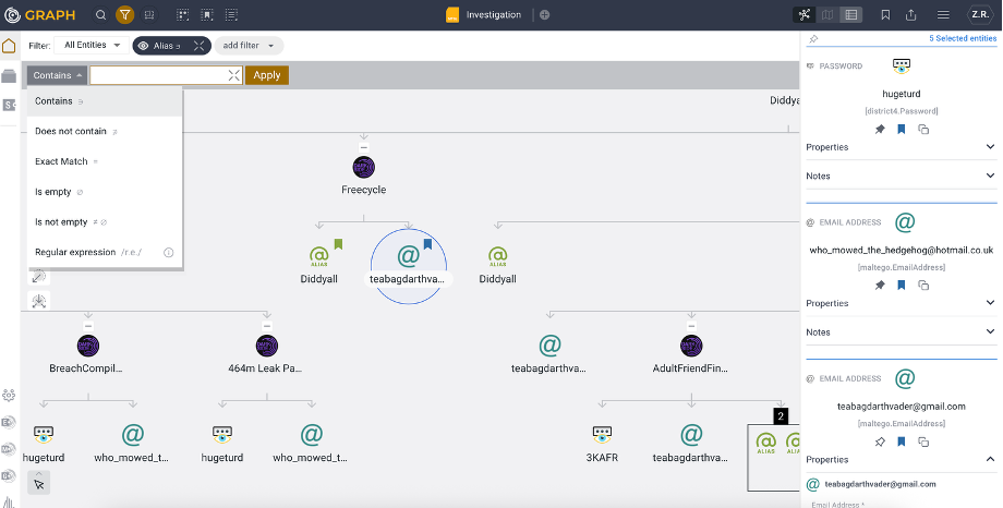Filters in Maltego Graph (Browser) allow investigators to search for properties within Entities, offering flexibility and precision to narrow down results. Filters support text, time, and number properties depending on the available data in the graph.