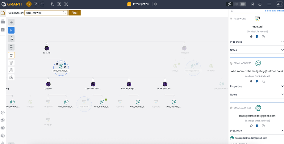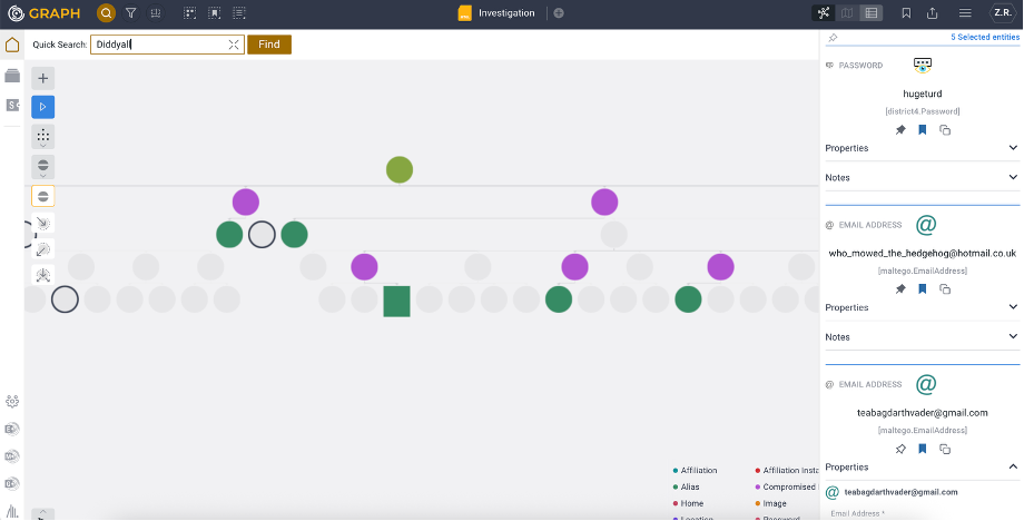 Quick Find in Maltego Graph (Browser) allows investigators to find Entities and their associated properties within the graph. This feature is particularly useful for pinpointing specific data points or connections in large and complex datasets.