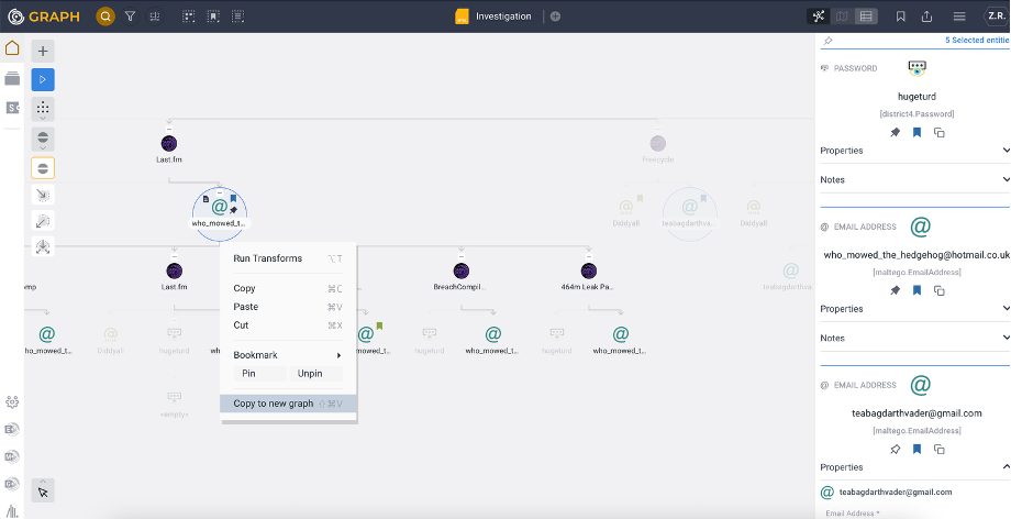 To declutter your graph or pivot in your investigation, you can copy selected Entities to a new graph. To do this, drag to select the desired Entities, right-click on the canvas, and choose “Copy to new graph”—or use the shortcut Cmd/Ctrl + Shift + V.