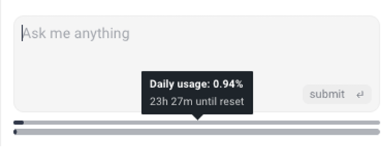 There are an hourly and a daily usage quota associated with the AI Assistant, which are related to the number of tokens used in interacting with the Assistant, as well as which models are used in the background. While it is not generally possible to predict how much of your quota any given query will use, you can track your usage quota as the percentage used out of your hourly and daily quota at the bottom of the chat window.