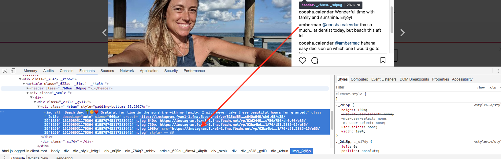 If you right-click on a photo, use the Inspect option to inspect the HTML element. You will be shown some code that has URLs to the original Instagram image as shown below: