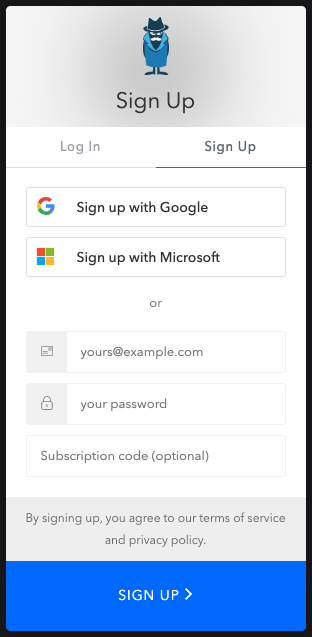 From here, you will be able to choose a sign-up method. You can choose to create an account using an available SSO (Single Sign-On service) such as Google or Microsoft. Otherwise, you can sign up using your username (email) and creating a password.