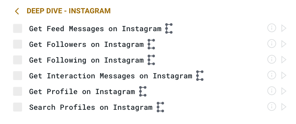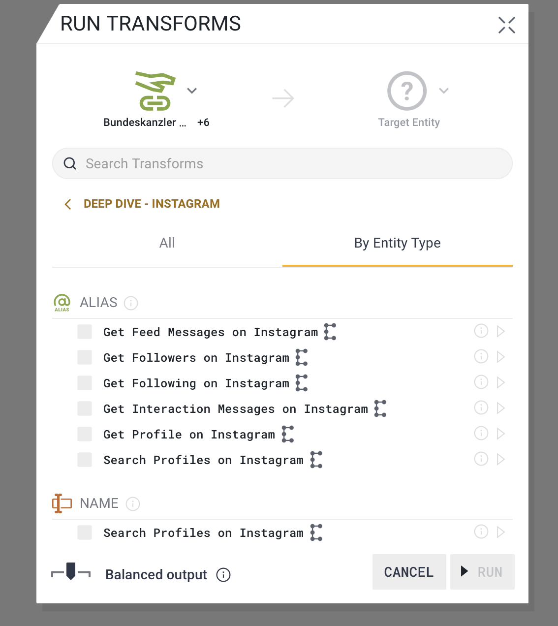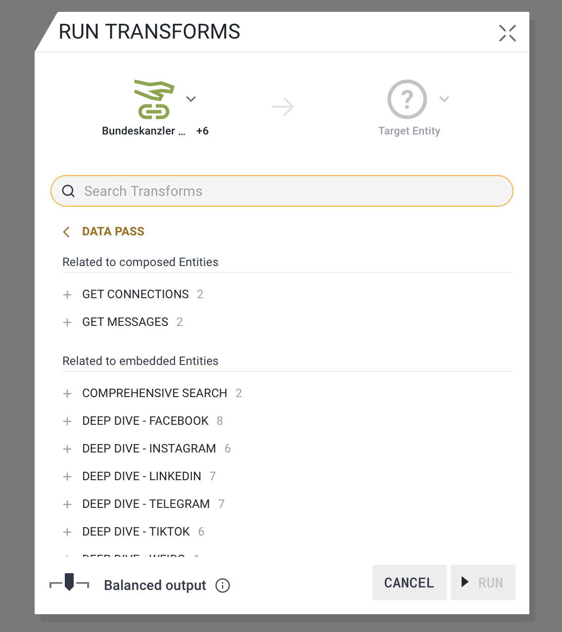 Advanced users with more precise needs can choose to expand the Composed Entity and run Transforms on Embedded Entities nested within. Available Transforms will change in this case based on the Entity type and Property rules within those Entities. For example, a user can run Transforms to get posts only from Instagram by running the appropriate Transform on the Instagram Embedded Entity instead of the Composed Entity.