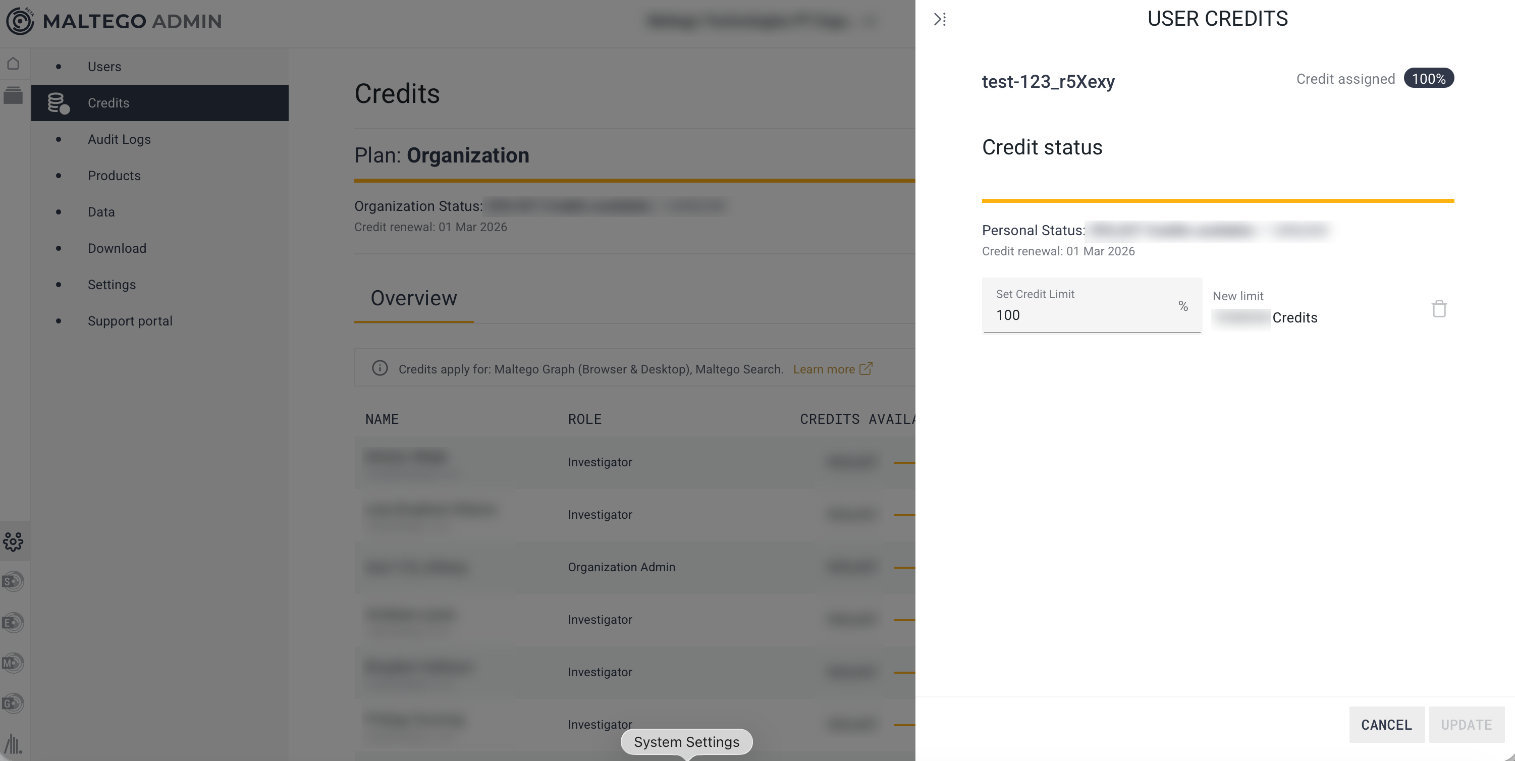 4. In the side panel you can set a percentage of your organization’s total Credit allowance. This user will now only have access to this specific amount of Credits.